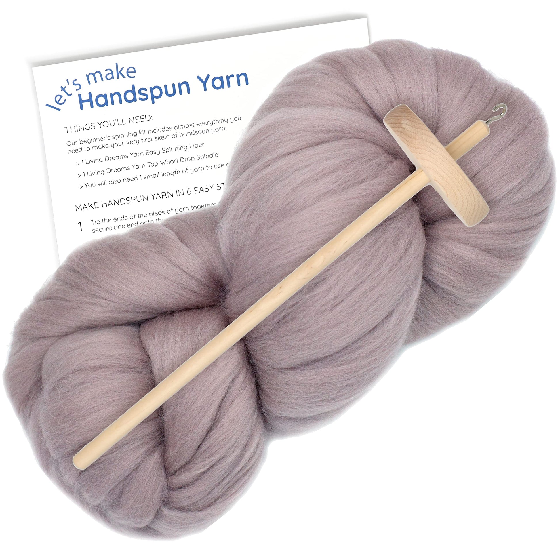 This kit includes everything you need to learn spinning your own yarn - a solid hardwood drop spindle, super soft Merino pencil roving and a set of instructions complete with a link to a video demonstration.